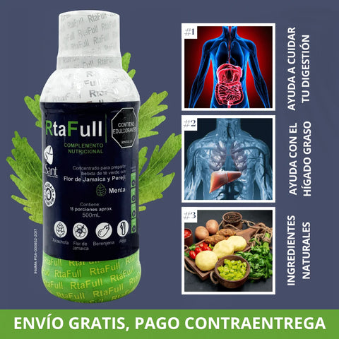 🌿 ¡Transforma tu salud digestiva y desintoxica tu cuerpo! RTAFULL: Bebida natural con té verde, flor de Jamaica y alcachofa. Regula el tránsito intestinal, reduce el colesterol y fortalece tus defensas. Sabor a menta y apto para adultos. ¡Bienestar en cada gota!